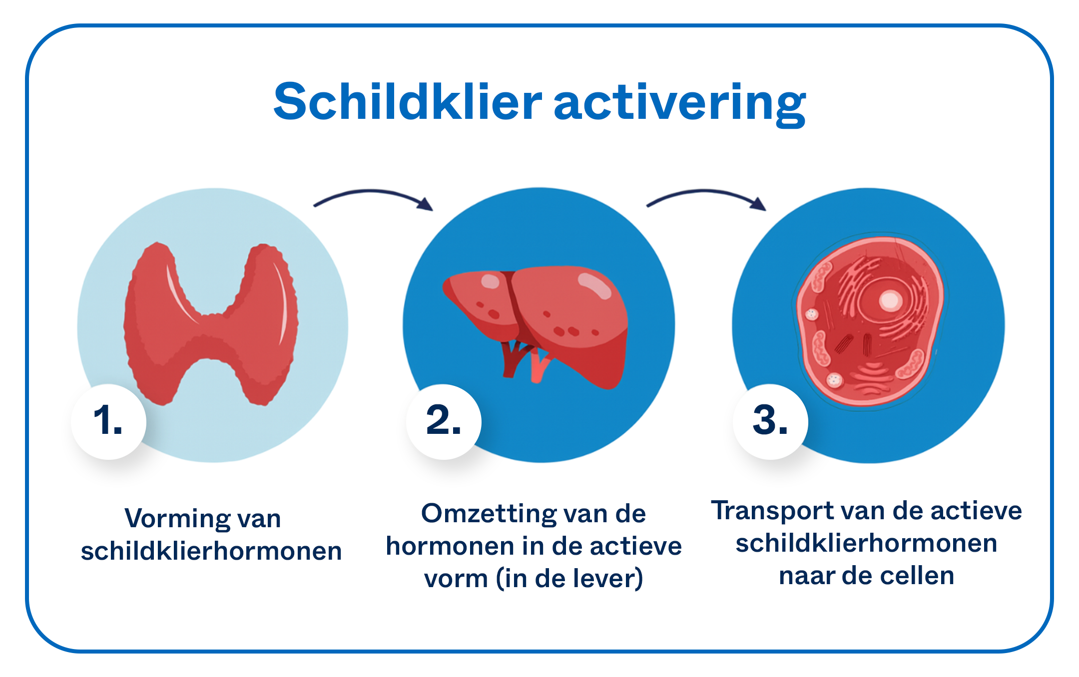 De schildklierhormonen moeten in een actieve vorm worden omgezet en vervolgens naar de cellen worden getransporteerd.