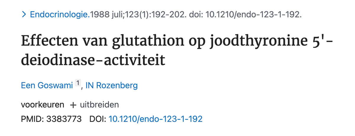 Effecten van glutathion op joodthyronine 5'-deiodinase-activiteit: https://pubmed.ncbi.nlm.nih.gov/3383773/